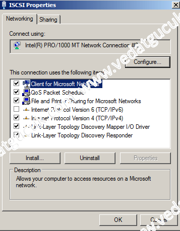 – Healtead ve iSCSI kartları üzerinde “File and Printer Sharing Microsoft Networks” kutucuğunu kaldırınız.