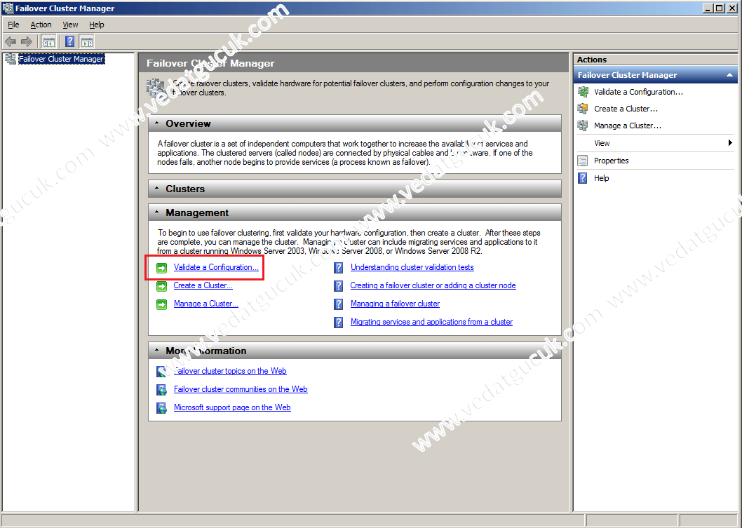 Gördüğümüz gibi herhangi bir ayar yada yapılandırma mevcut değil. Öncelik ile cluster yapımızın sağlıklı çalışıp çalışmadığını test etmemiz gerekmektedir. Bunun için Validate a Configuration seçeneğine tıklayarak ilerliyoruz.