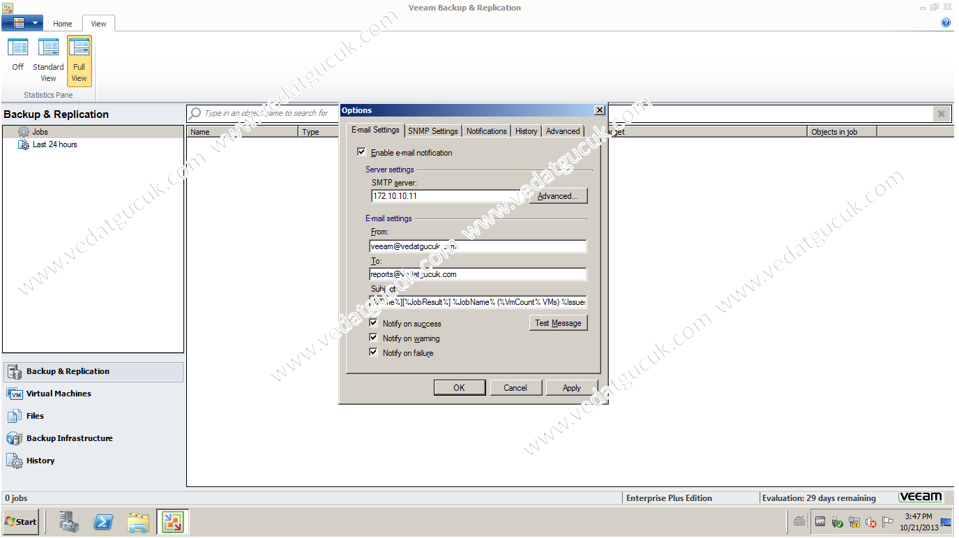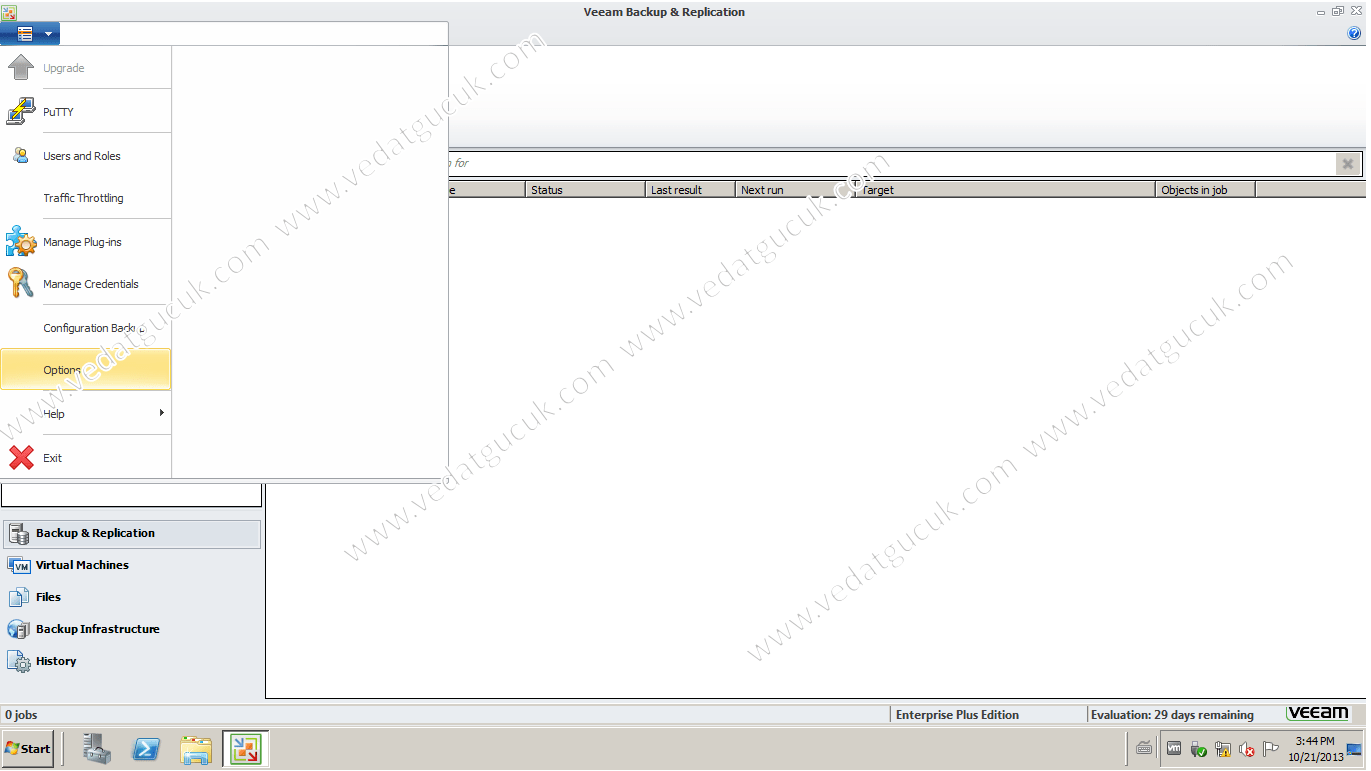 Veeam Backup Replication Configuration için Veeam konsolu açıyoruz. Konsol açıldıktan sonra Options’i açıyoruz.