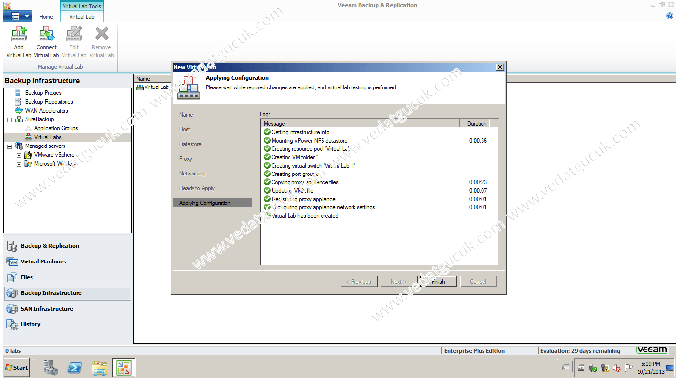 Virtual Lab başarılı olarak oluşturuldu ve Finish ile kurulumu bitiriyoruz.