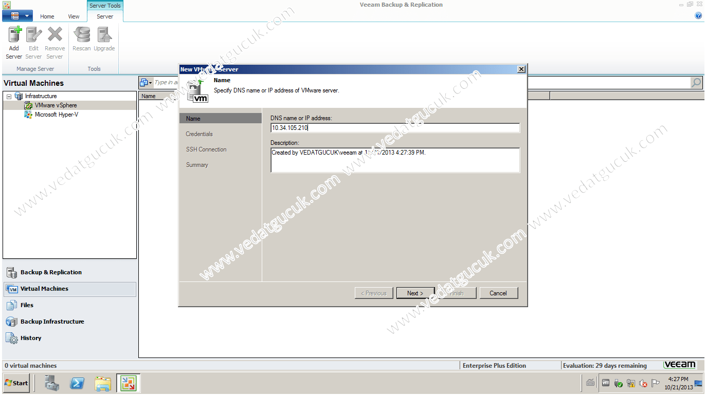 Açılan pencerede Vcenter yada Direk ESXi Hostumuzun IP adresini giriyoruz. Ücretsiz version ESXi sürümlerini Veeam desteklememektedir.